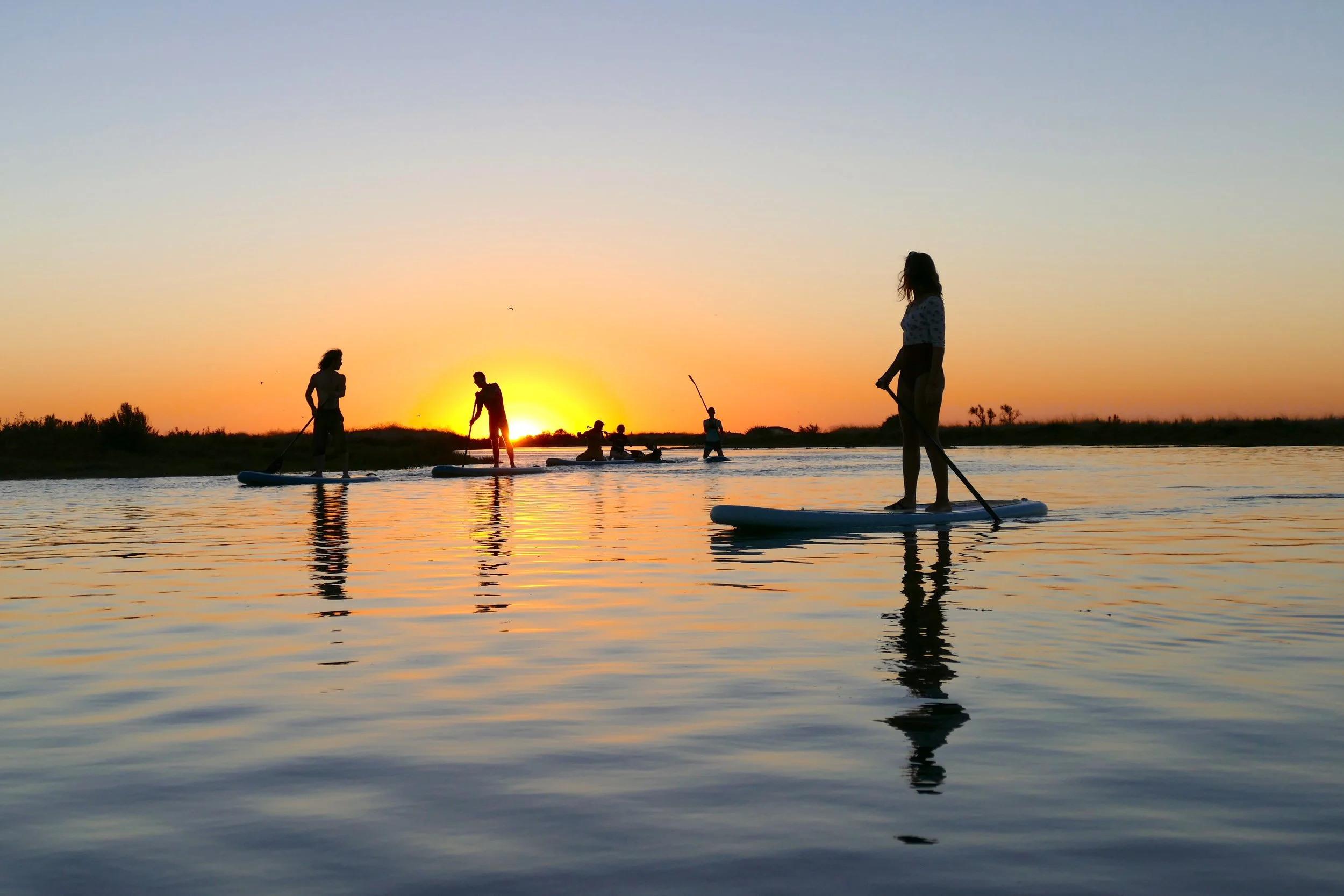 Des visiteurs pratiquant le stand up paddle sur l'eau au coucher du soleil, avec une femme et un enfant sur la même planche dans les marais de l'île de ré.